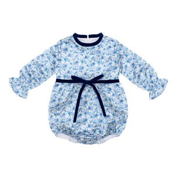 Our Hazel Bubble is a timeless silhouette designed with your littlest girls in mind. Now available in Prescott Petals—a delicate blue floral that coordinates beautifully with our boys' Prescott Plaid—this one-piece is finished with a sweet Back Bay Blue Velvet bow at the waist for an extra touch of fall charm.