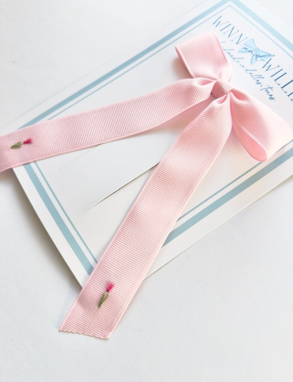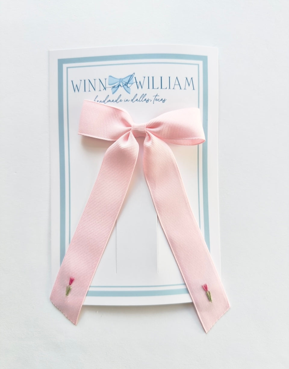Double Tulip Hand Embroidered Bow - is backordered and will ship as soon as it is back in stock.