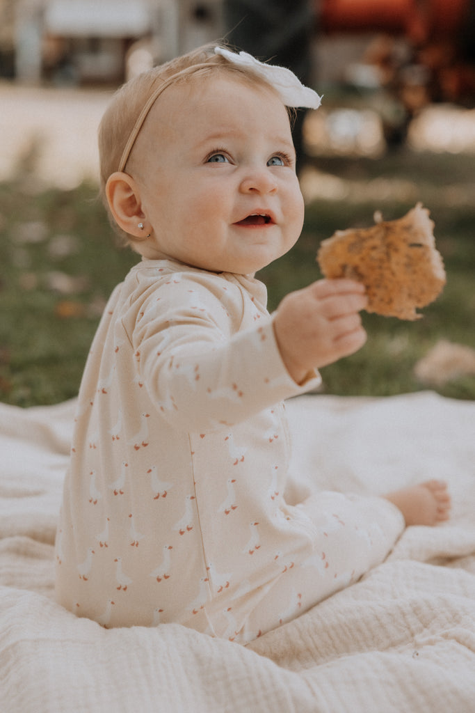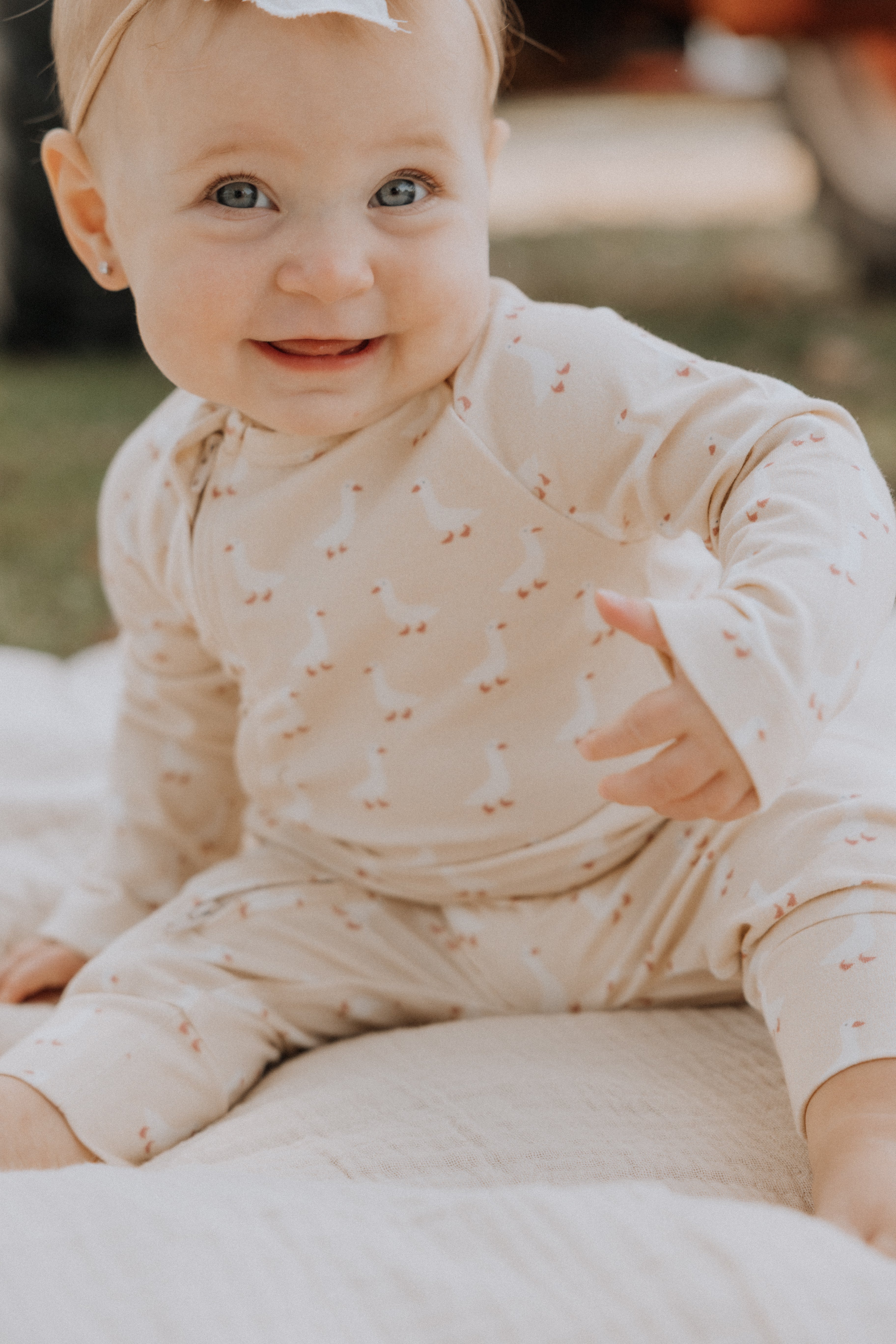 Organic Cotton Playsuit - Geese - is backordered and will ship as soon as it is back in stock.