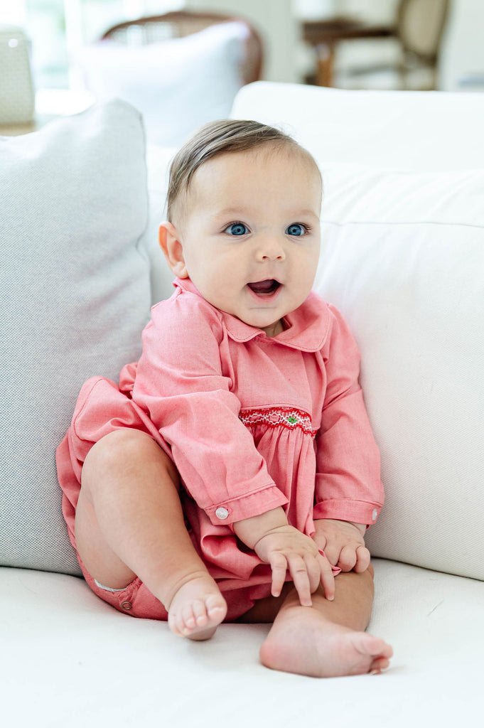 Dress him in holiday cheer with this smocked red and green Christmas bubble! Perfect for festive occasions, from family photos to holiday gatherings, this long-sleeve bubble features a classic collar and hand-smocked detailing in red and green across the chest. Made from soft red chambray, it keeps little ones comfortable while looking perfectly polished for the season. Gentle elastic at the legs allows for easy movement and all-day comfort.