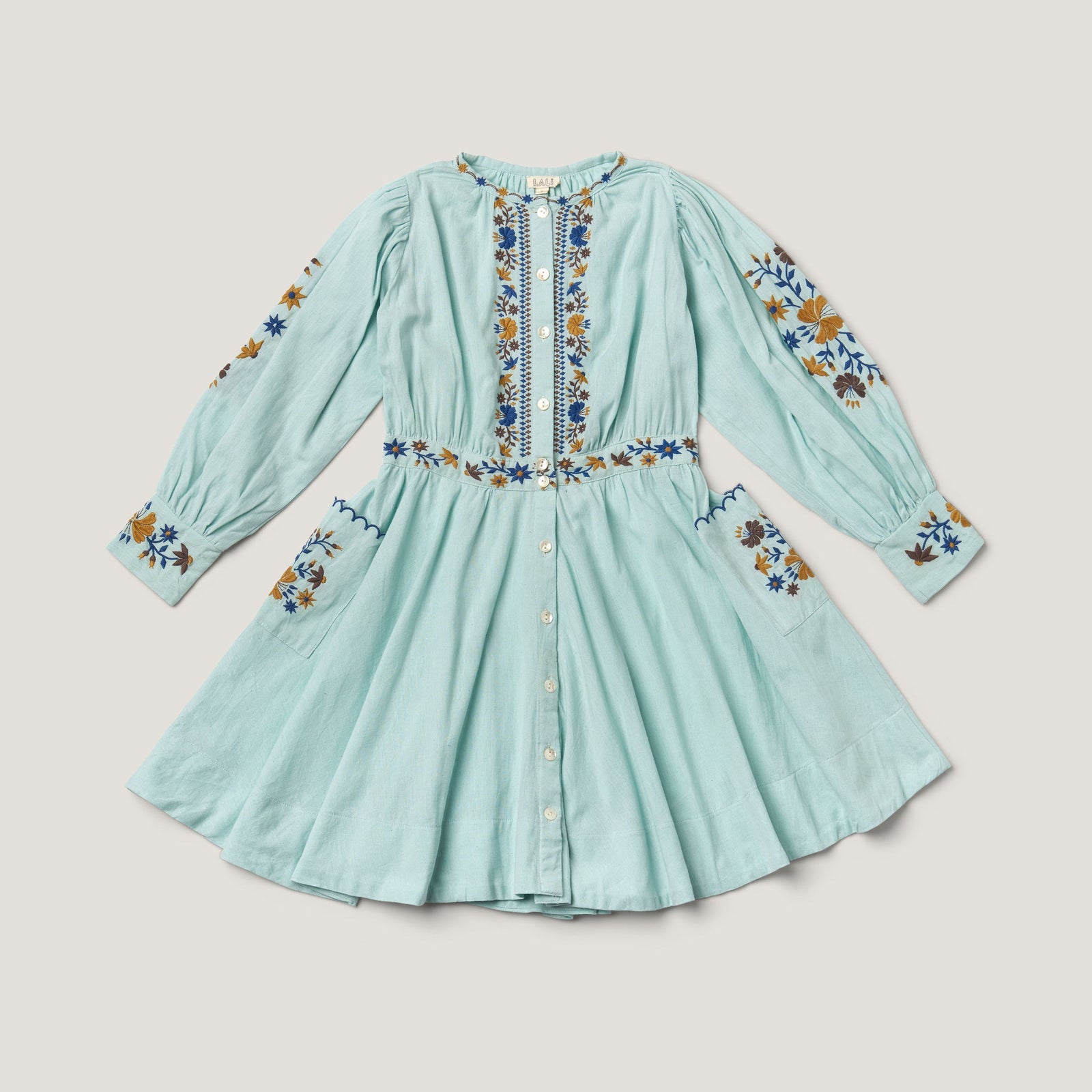 With a nod to heirloom corset covers, the Blair Dress returns this season in soft Blue Haze—a wintry hue that feels both calm and luminous. Delicate embroidery traces the bodice and cuffs, adding quiet charm to its vintage-inspired silhouette. Soft gathers at the neckline and a full circle skirt create an easy, twirl-worthy shape, while a row of delicate buttons runs from collar to hem.