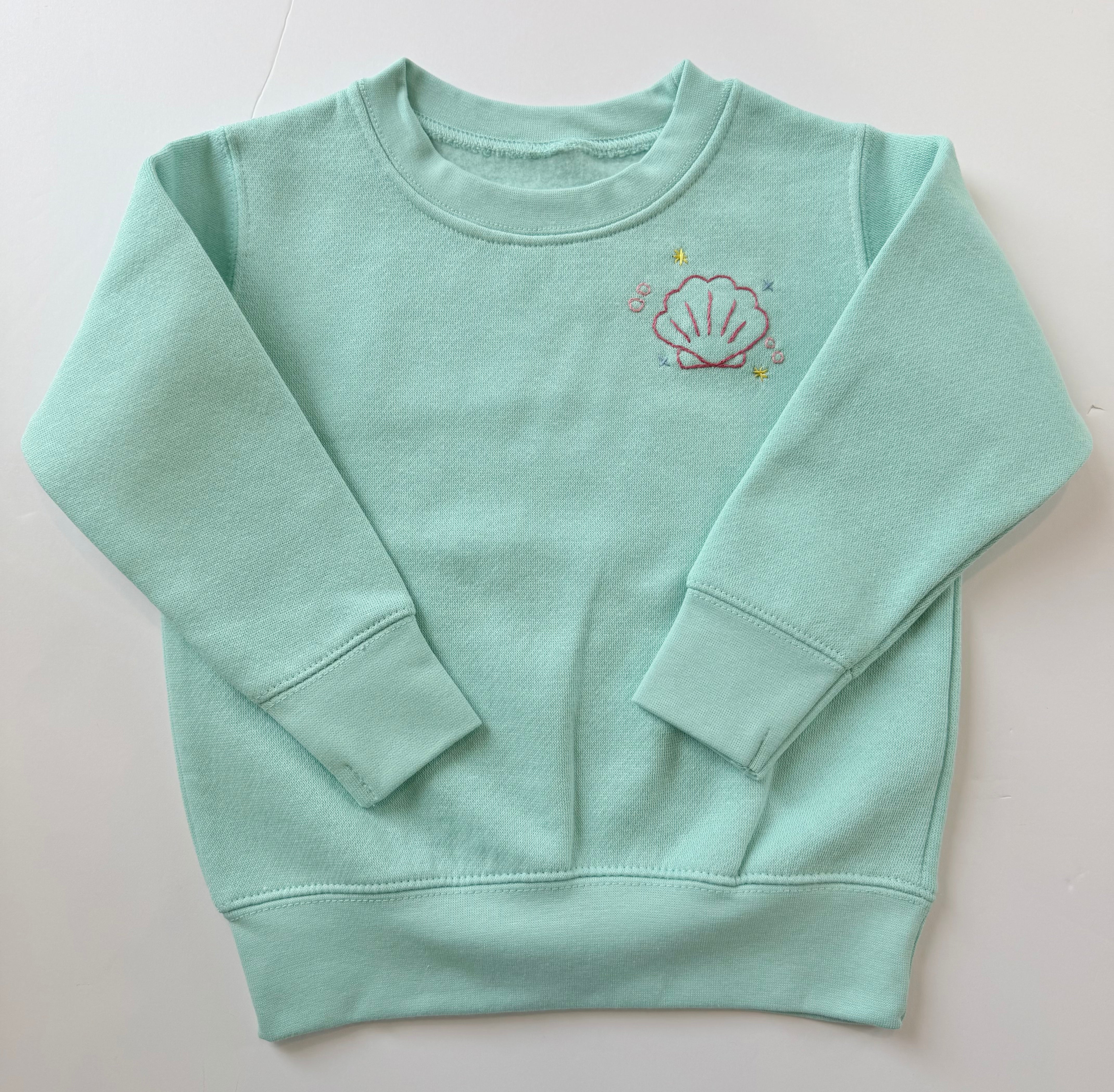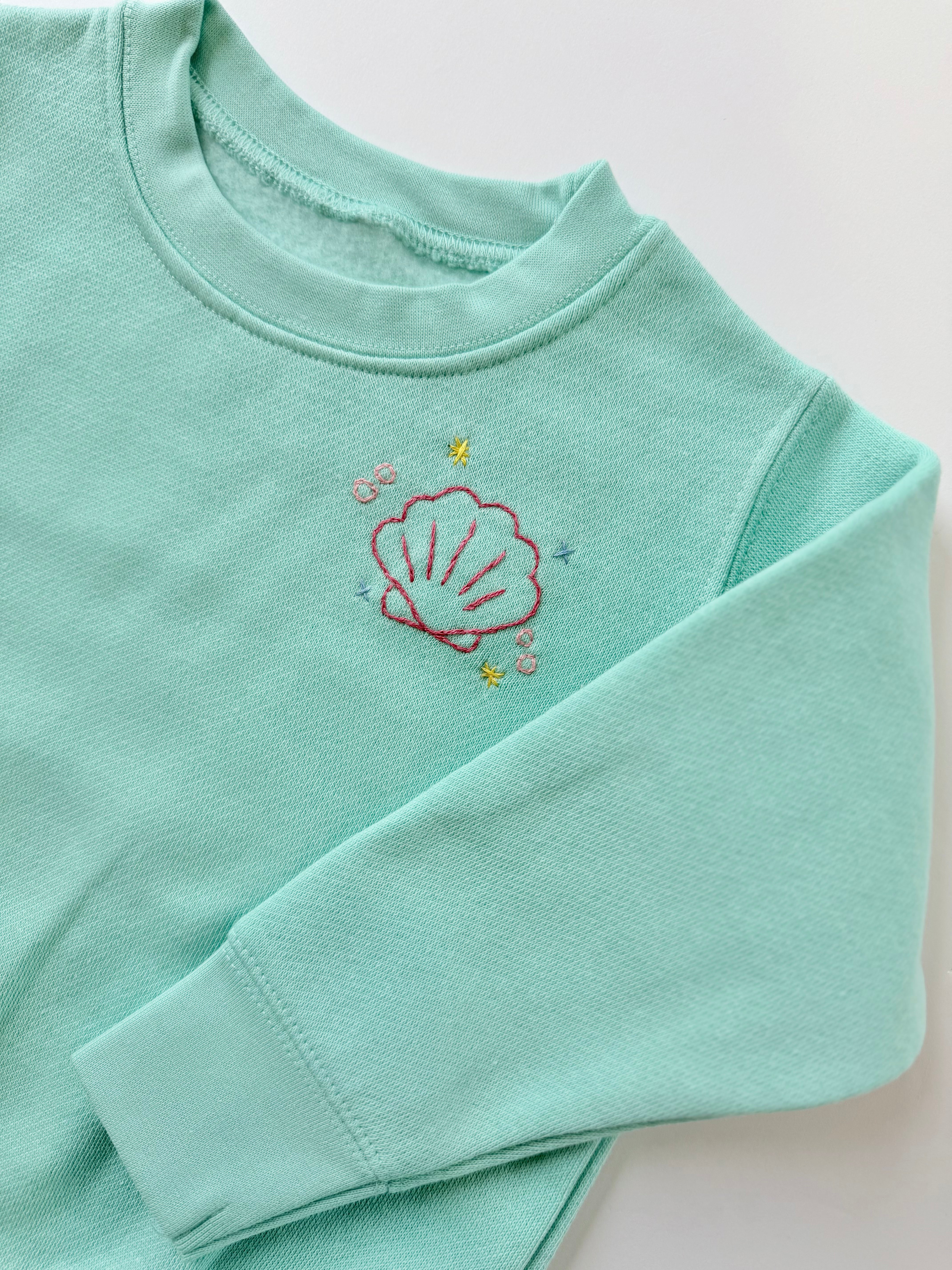 Handstitched on a heather cream sweatshirt.