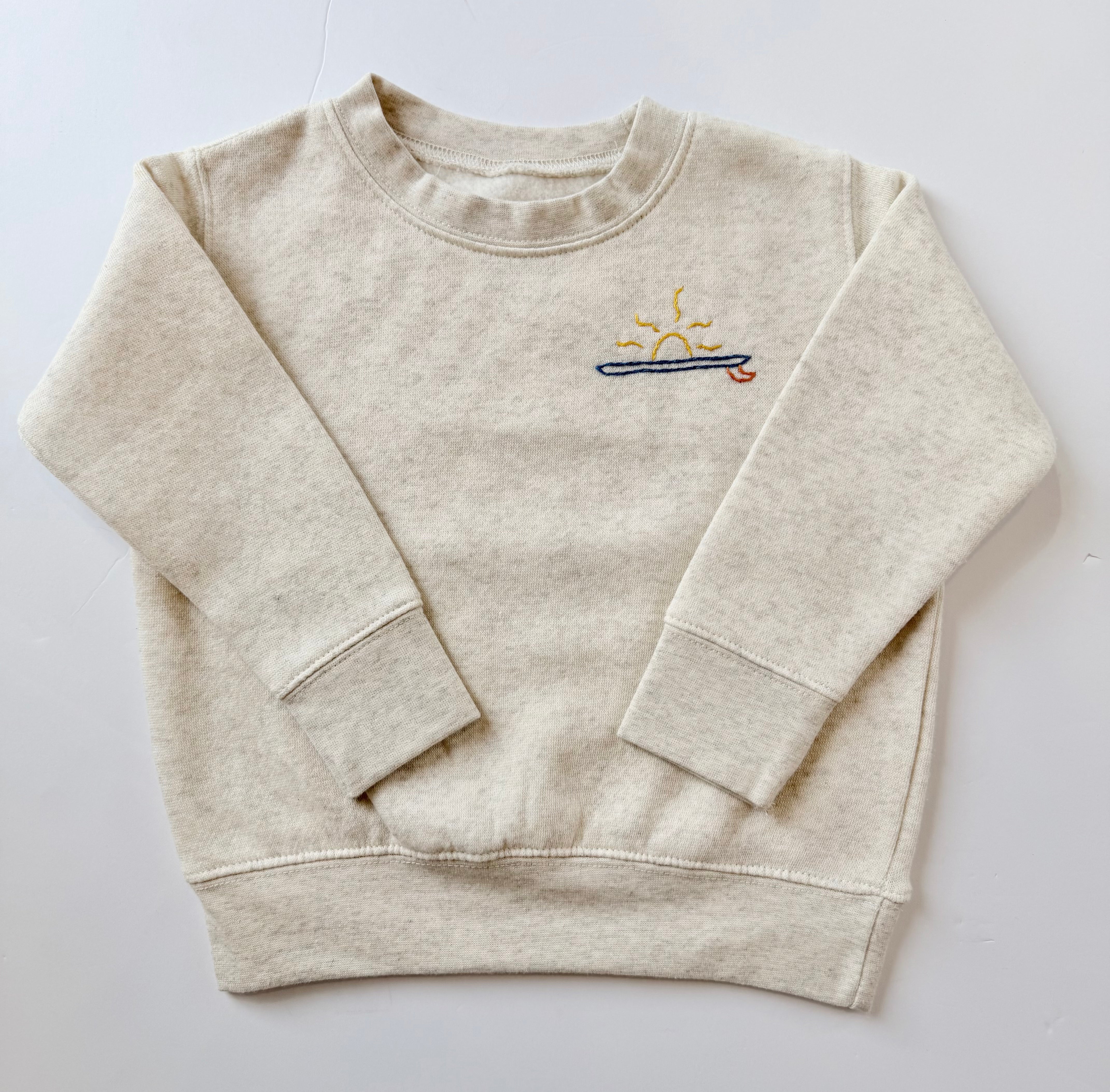 Handstitched on a heather cream sweatshirt.